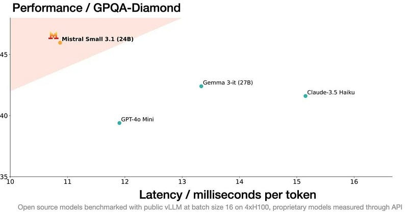 Look at the Benchmark chart: The horizontal axis is speed, the smaller the faster; the vertical axis is knowledge, the larger the stronger. Mistral Small 3.1 directly dominates the upper left corner, with speed and knowledge double buffs.