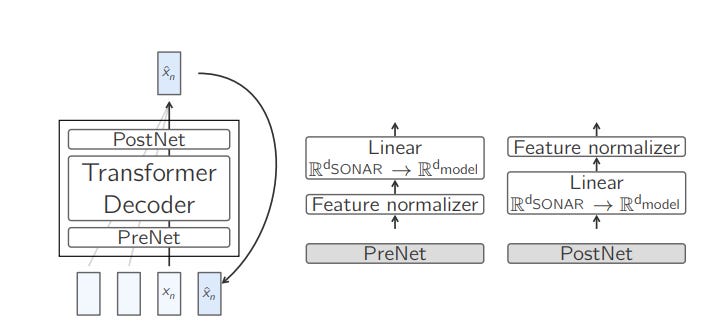 Basically, he creates a PreNet class to normalize the input embeddings before the main model processes them. It transforms the input SONAR embeddings into a format suitable for the model’s hidden dimensions. This normalization helps stabilize the training process and improve the model’s performance by appropriately scaling the input data.