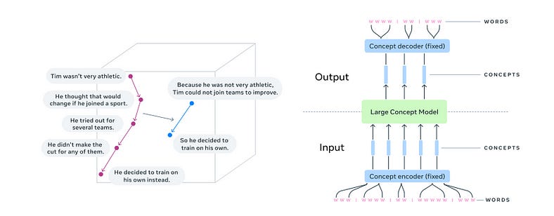 In contrast LCM (Large Concept Model): for example imagine that your brain can directly understand an entire sentence or paragraph as a complete “meaning unit”, just like giving each sentence or paragraph a label or a summary. When you read the book, you no longer need to remember every word but remember each “meaning unit”. In this way, even if the book is long, you only need to remember relatively few “meaning units”, the memory burden is greatly reduced, and the understanding will be more coherent and accurate.