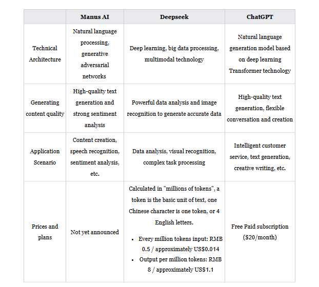 While Manus AI, Deepseek, and ChatGPT are all based on large language models, they each have distinct strengths and applications. Manus AI stands out as a general-purpose AI agent capable of autonomous task execution, making it highly versatile across various domains.